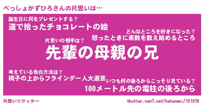 | 胡散臭い通販商品みたいなあだ名 | 『モテモテ間違いなしブレスレット…その名も「べっしょかずひろ」』 |