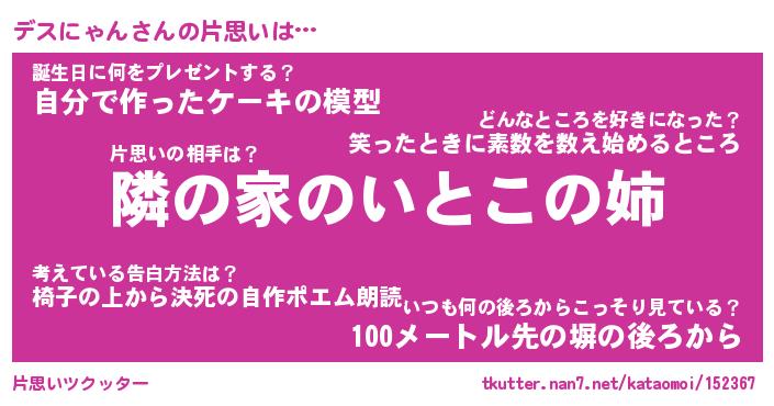 | 男性向けラノベタイトル風あだ名 | 『デスにゃんの憂鬱』 |