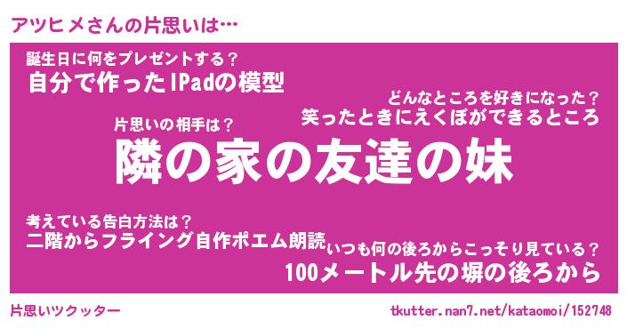 | ヘコむあだ名 | 『アツっふぃ~』『つくし』 |