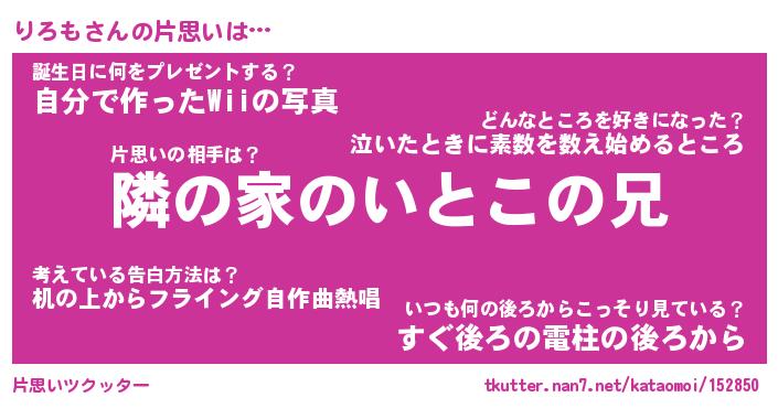 | ヘコむあだ名 | 『りろもー』『つくし』『りろぷりん』 |