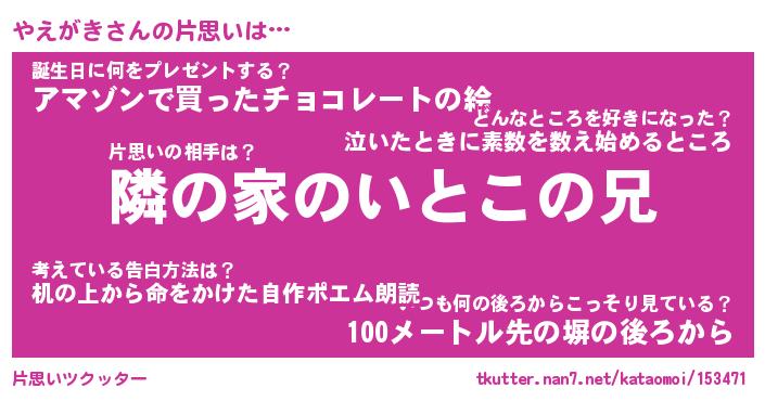 | 2回繰り返すあだ名 | 『やえやえ』『ややええ』『ぬめぬめ』 |