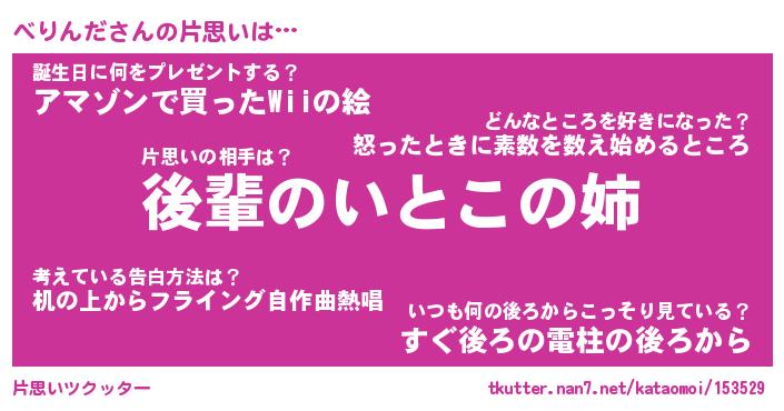 | ヘコむあだ名 | 『べりにゅー』『なまこ酢』『べりを』 |
