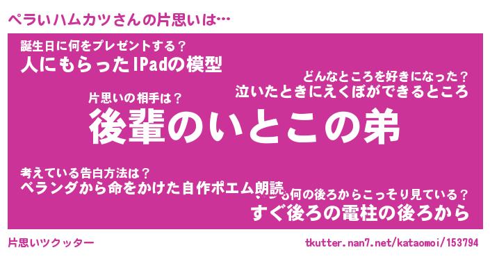 | 女子向けラノベタイトル風あだ名 | 『ペラいハムカツ姫と円卓の騎士』 |