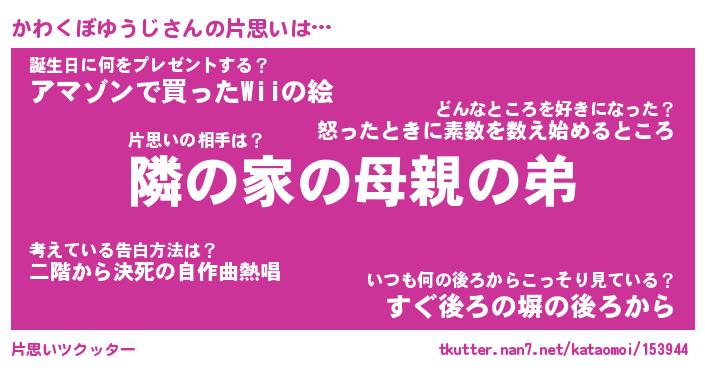 | 男性向けラノベタイトル風あだ名 | 『かわくぼゆうじの憂鬱』 |