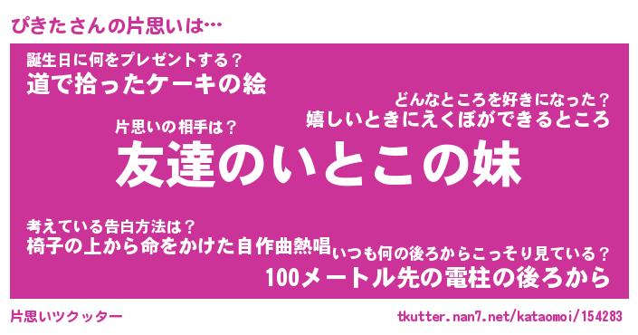 | ヘコむあだ名 | 『ぴきにゅー』『牛乳』『ぴきっちょ』 |