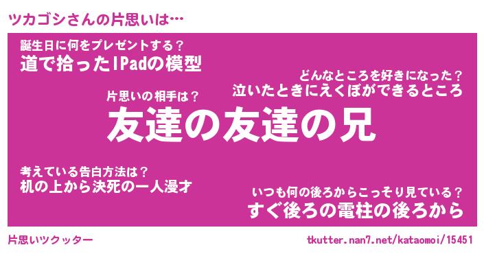 | 男性向けラノベタイトル風あだ名 | 『ツカゴシアートオンライン』 |