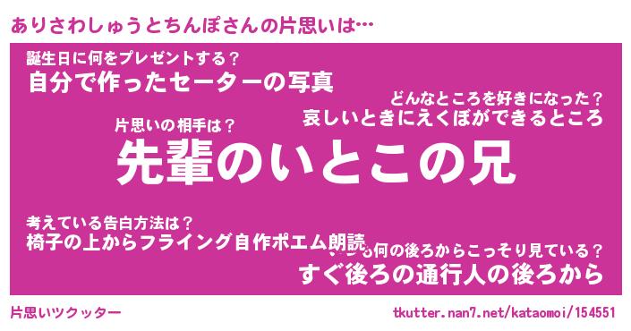 | 男性向けラノベタイトル風あだ名 | 『ありさわしゅうとちんぽの憂鬱』 |