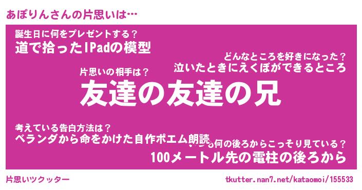 | ヘコむあだ名 | 『あぽっふぃ~』『豆乳』『あぽを』 |