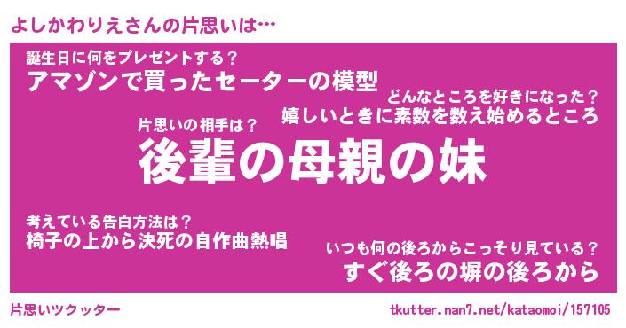 | 女子向けラノベタイトル風あだ名 | 『誰かこのよしかわりえを説明してください! ~契約から始まるウェディング~』 |