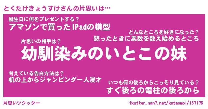 | 男性向けラノベタイトル風あだ名 | 『とくたけきょうすけの憂鬱』 |