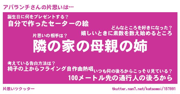 | ヘコむあだ名 | 『アバふぇ~』『牛乳』『アバぷりん』 |