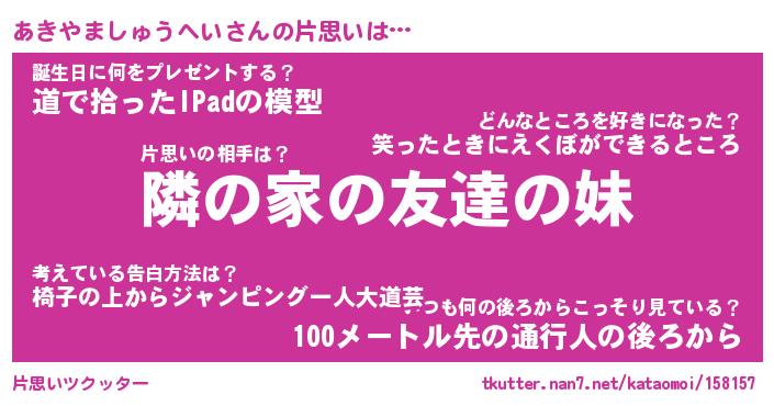 | 伝説のあだ名 | 『伝説のスナイパーあきやましゅうへい』 |
