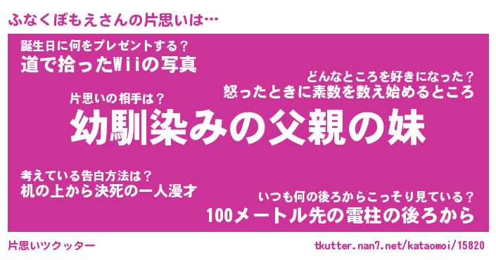 | 女子向けラノベタイトル風あだ名 | 『(仮)ふなくぼもえのやんごとなき事情』 |