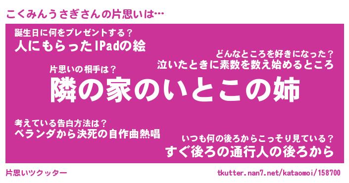 | 男性向けラノベタイトル風あだ名 | 『こくみんうさぎの憂鬱』 |