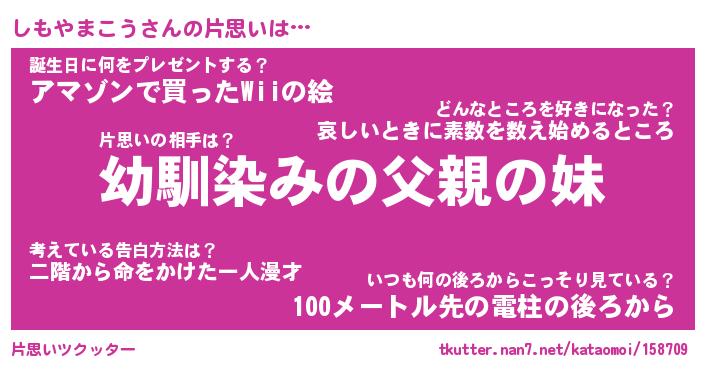 | 女子向けラノベタイトル風あだ名 | 『(仮)しもやまこうのやんごとなき事情』 |
