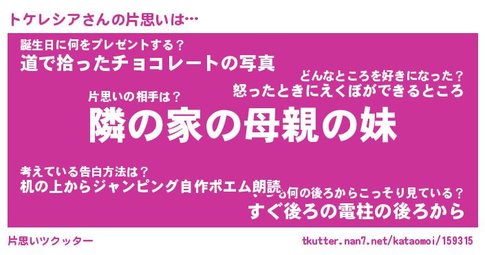 | 男性向けラノベタイトル風あだ名 | 『トケレシアの憂鬱』 |