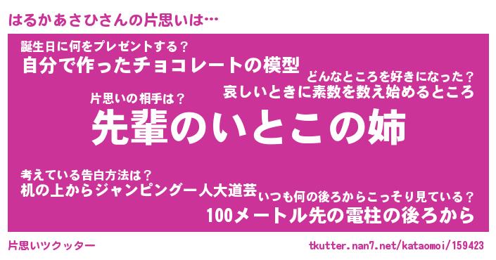 | 胡散臭い通販商品みたいなあだ名 | 『モテモテ間違いなし霊験あらたかなお札…その名も「はるかあさひ」』 |