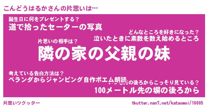 | 男性向けラノベタイトル風あだ名 | 『こんどうはるかの憂鬱』 |