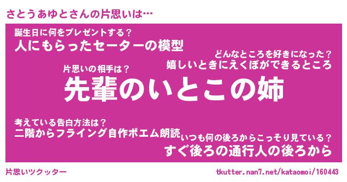 | 男性向けラノベタイトル風あだ名 | 『さとうあゆとの憂鬱』 |