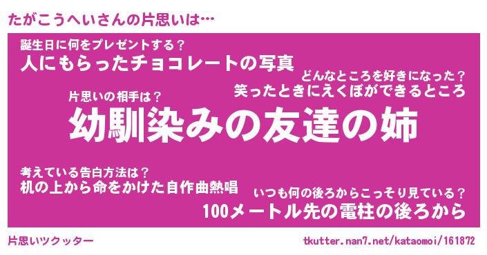 | 男性向けラノベタイトル風あだ名 | 『たがこうへいの憂鬱』 |