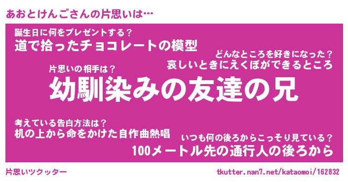 | ヒーロー風カッコイイあだ名 | 『スーパーアオトケンゴ』『幻影騎士アオ』 |