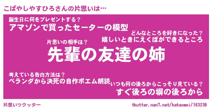 | ヘコむあだ名 | 『こばっふぃ~』『なまこ酢』 |