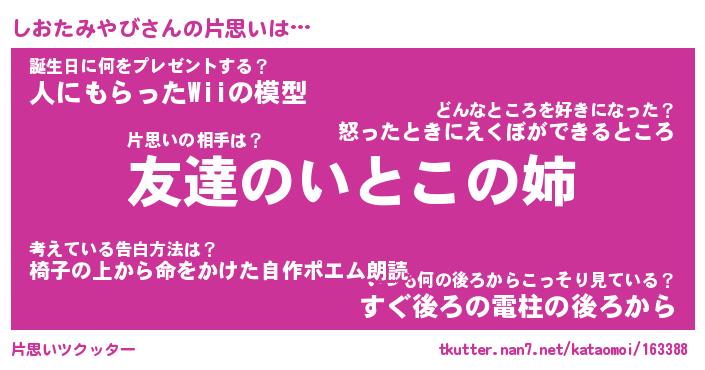 | 恥ずかしいあだ名 | 『プリティーしおたみやび』『しおっちょ』 |