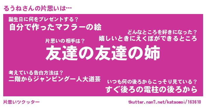 | ヘコむあだ名 | 『るうもー』『つくし』『るう太郎』 |