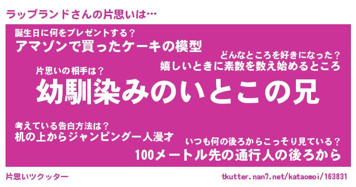 | ヘコむあだ名 | 『ラッにゅー』『なまこ酢』『ラッを』 |