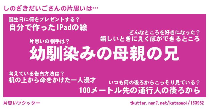 | 男性向けラノベタイトル風あだ名 | 『しのざきだいごの憂鬱』 |
