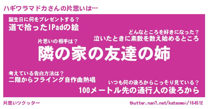 | 女子向けラノベタイトル風あだ名 | 『(仮)ハギワラマドカのやんごとなき事情』 |