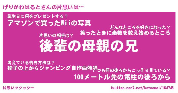 | 胡散臭い通販商品みたいなあだ名 | 『億万長者になれるブレスレット…その名も「げりかわはると」』 |