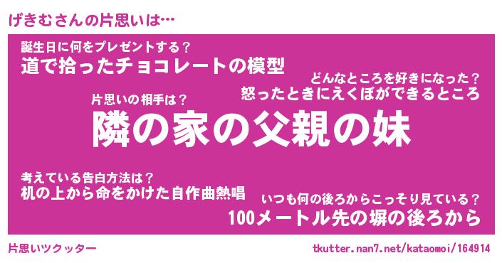 | ヘコむあだ名 | 『げきにゅー』『豆乳』『げきを』 |