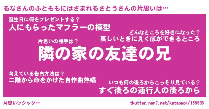 | 料理風あだ名 | 『ほっこり♪るなさんのふとももにはさまれるさとうの味噌そぼろ煮』 |