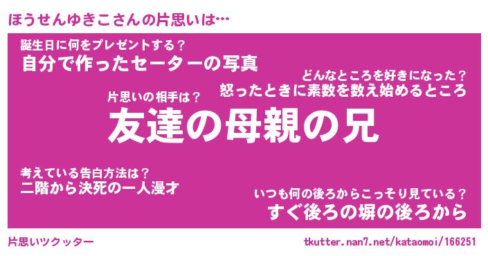 | 胡散臭い通販商品みたいなあだ名 | 『億万長者になれるブレスレット…その名も「ほうせんゆきこ」』 |
