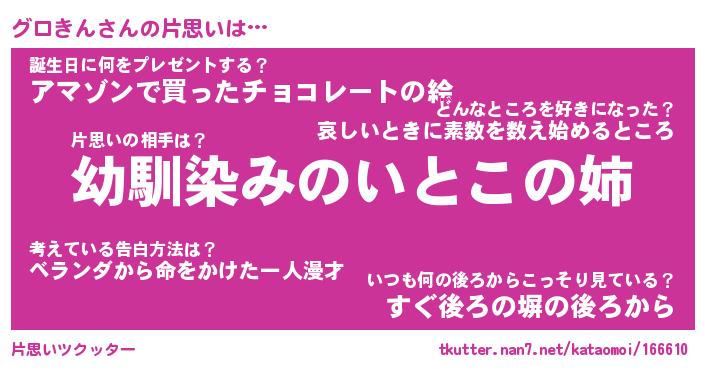 | 男性向けラノベタイトル風あだ名 | 『グロきんの憂鬱』 |