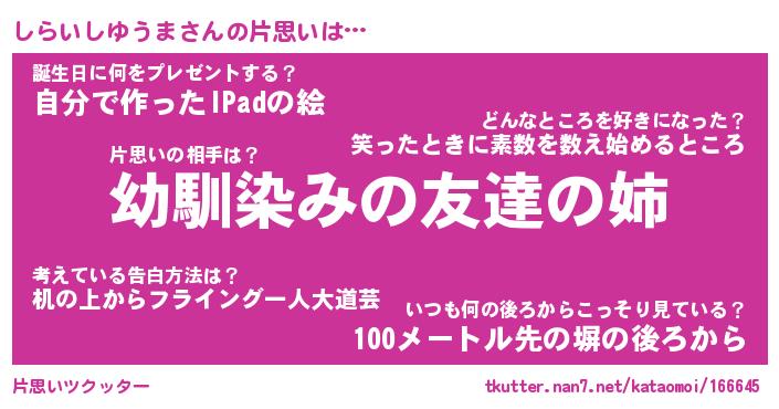 | 男性向けラノベタイトル風あだ名 | 『しらいしゆうまの憂鬱』 |