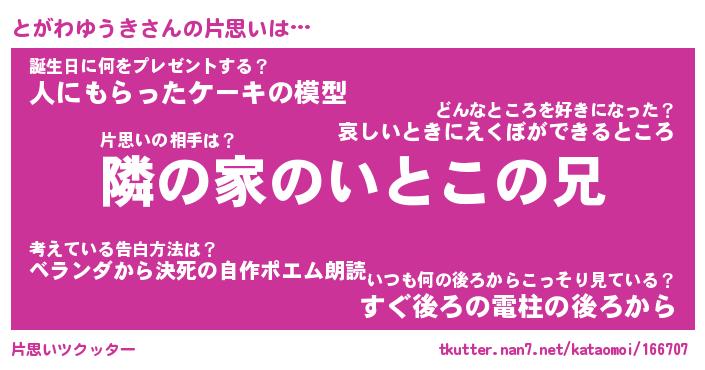 | ヘコむあだ名 | 『とがにゅー』『牛乳』『とがを』 |