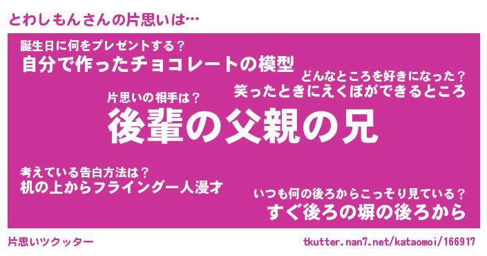 | ヘコむあだ名 | 『とわふぇ~』『レバニラ』『とわお』 |