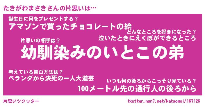 | 男性向けラノベタイトル風あだ名 | 『たきがわまさきの憂鬱』 |