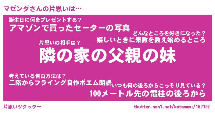 | 意味不明あだ名 | 『ペロリンマゼンダ』『永久保存マゼンダ』 |