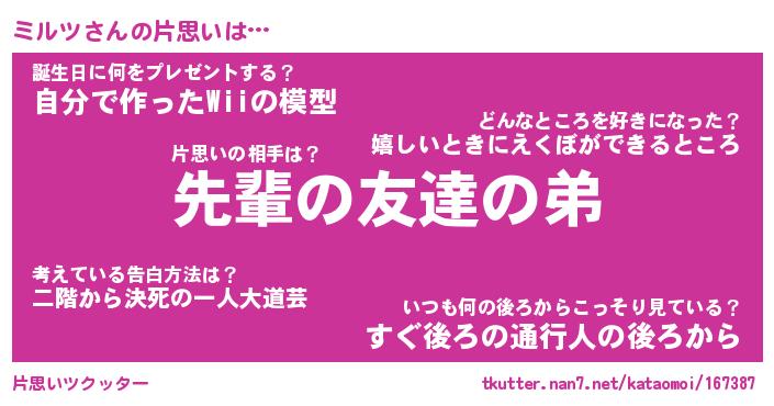 | ヘコむあだ名 | 『ミルっふぃ~』『つくし』 |