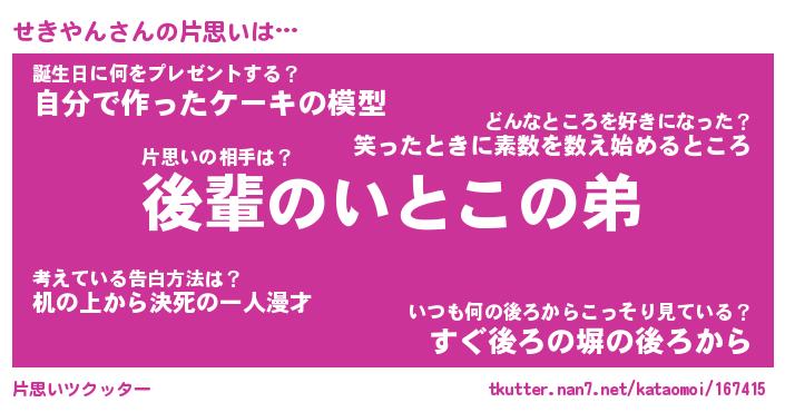 | ヘコむあだ名 | 『せきにゅー』『豆乳』『せき太郎』 |