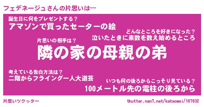| 胡散臭い通販商品みたいなあだ名 | 『モテモテ間違いなしブレスレット…その名も「フェデネージュ」』 |