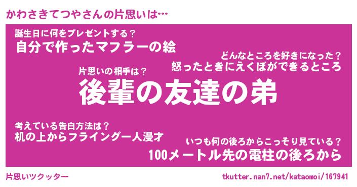 | 胡散臭い通販商品みたいなあだ名 | 『モテモテ間違いなし霊験あらたかなお札…その名も「かわさきてつや」』 |