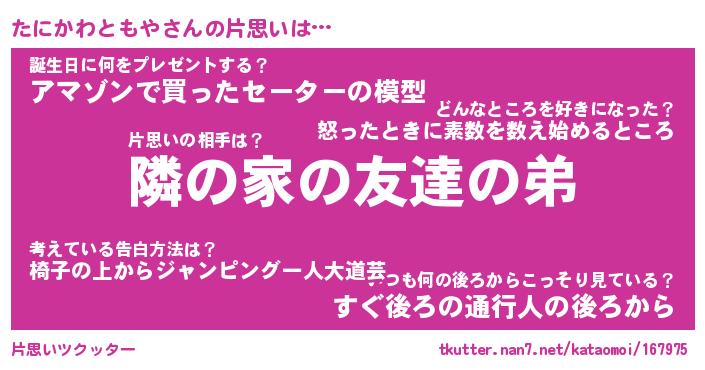 | 恥ずかしいあだ名 | 『プリティーたにかわともや』『たにちん』 |