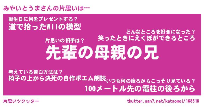 | 男性向けラノベタイトル風あだ名 | 『みやいとうまの憂鬱』 |