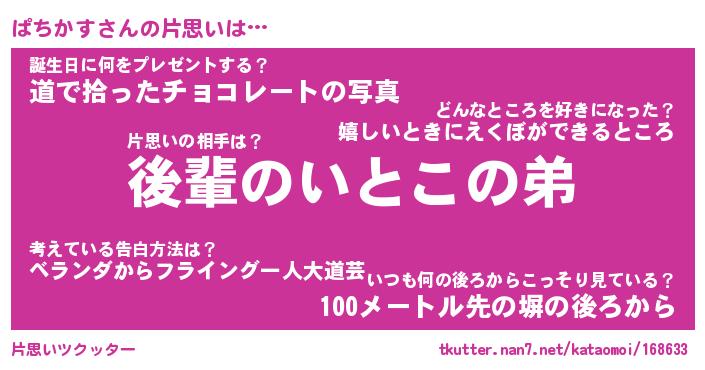 | ヘコむあだ名 | 『ぱちもー』『牛乳』『ぱちっちょ』 |