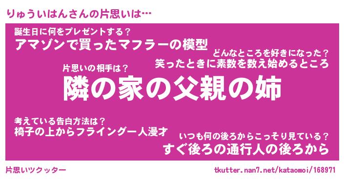 | 男性向けラノベタイトル風あだ名 | 『りゅういはんの憂鬱』 |