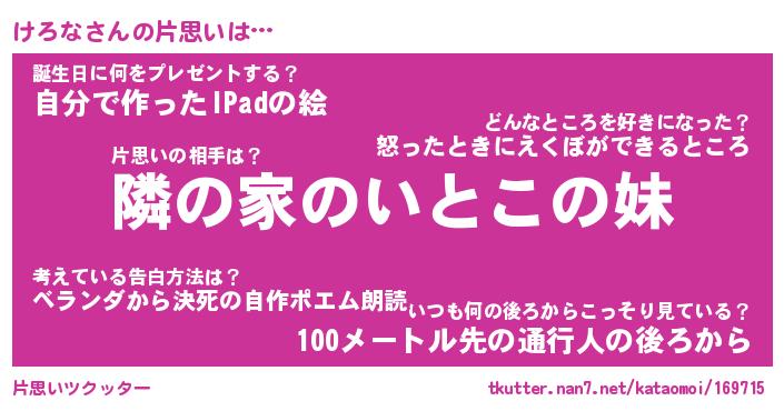 | ヘコむあだ名 | 『けろもー』『つくし』『けろぷりん』 |